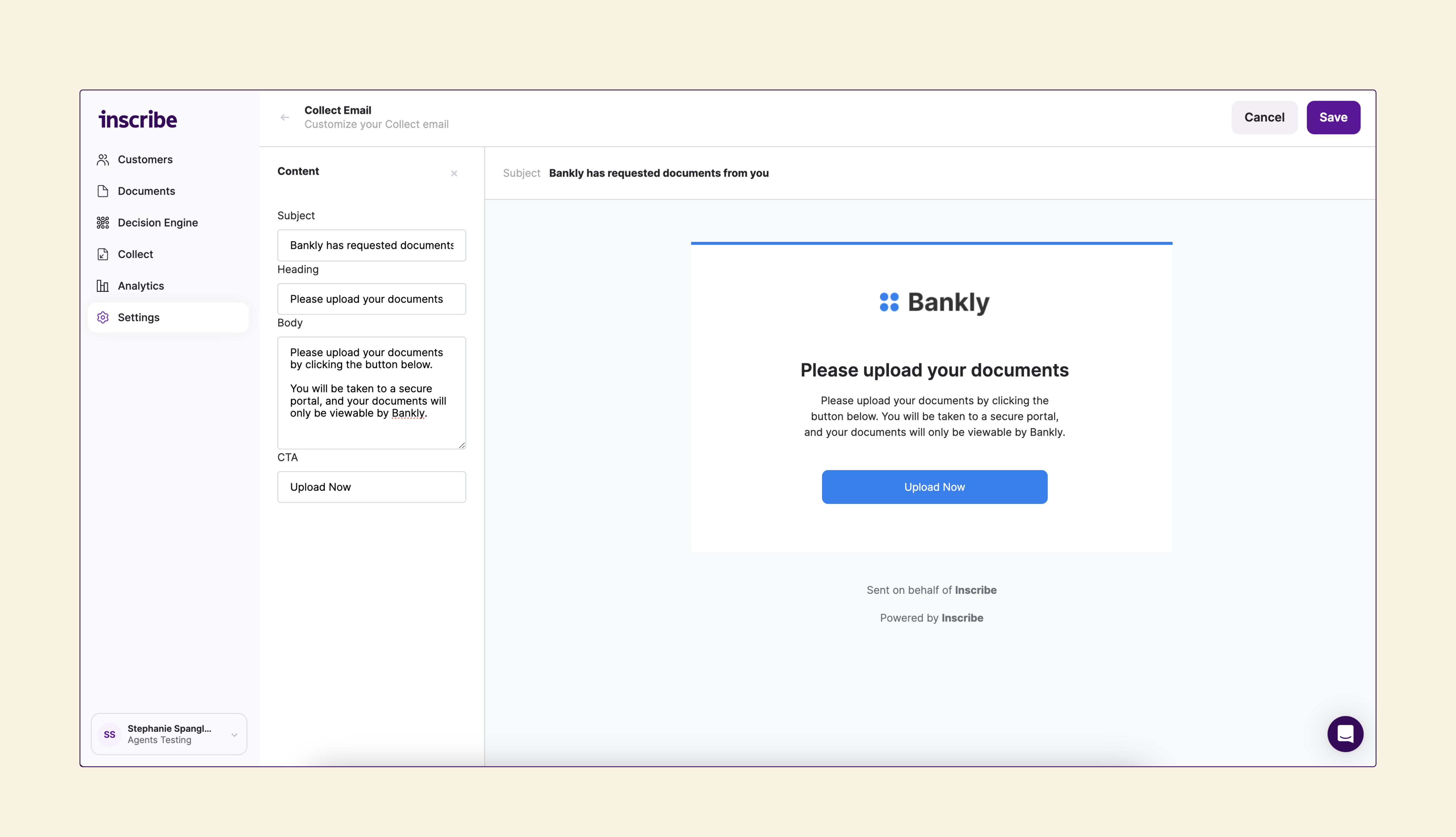 Once your customizations have been made, requesting documents from applicants is easy. From the customer view in Inscribe, you'll select 'Collect,' then specify the documents you need and how you want to send the request (via email or a shareable link).