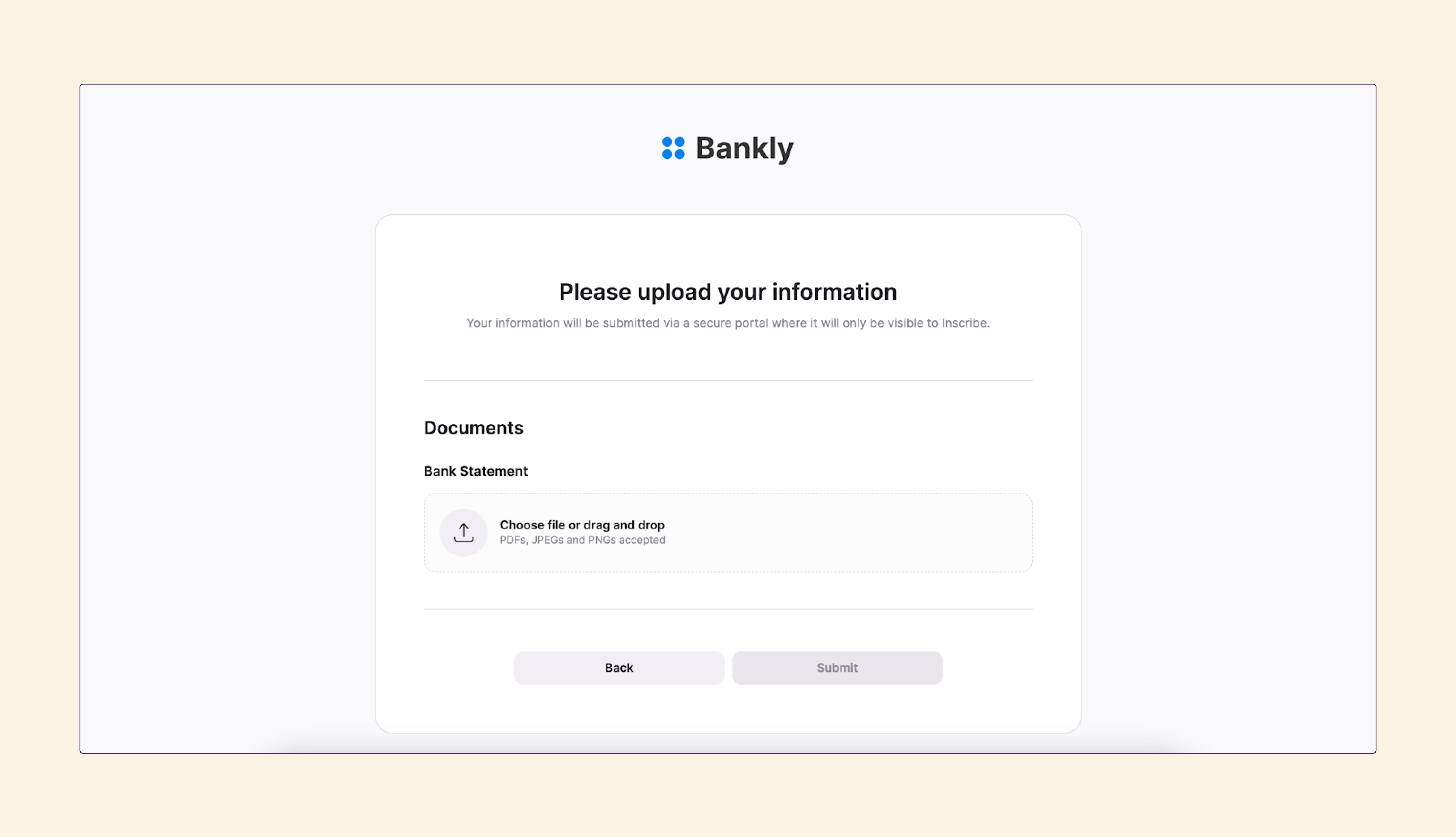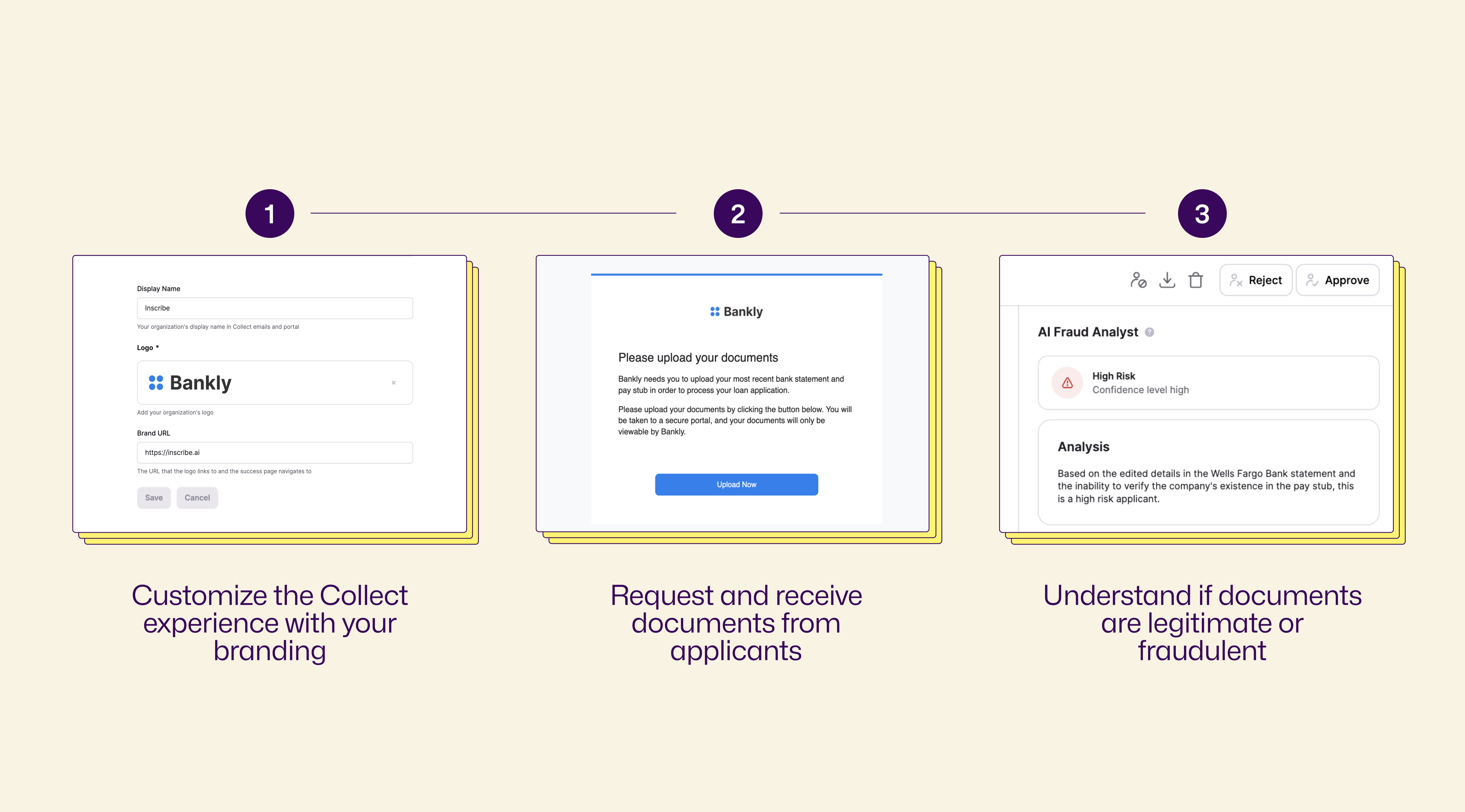 Inscribe also gives you the flexibility to integrate Collect into your existing processes via the API or embeddable iFrame, so you can create a truly custom and low-lift experience that fits your desired workflow.