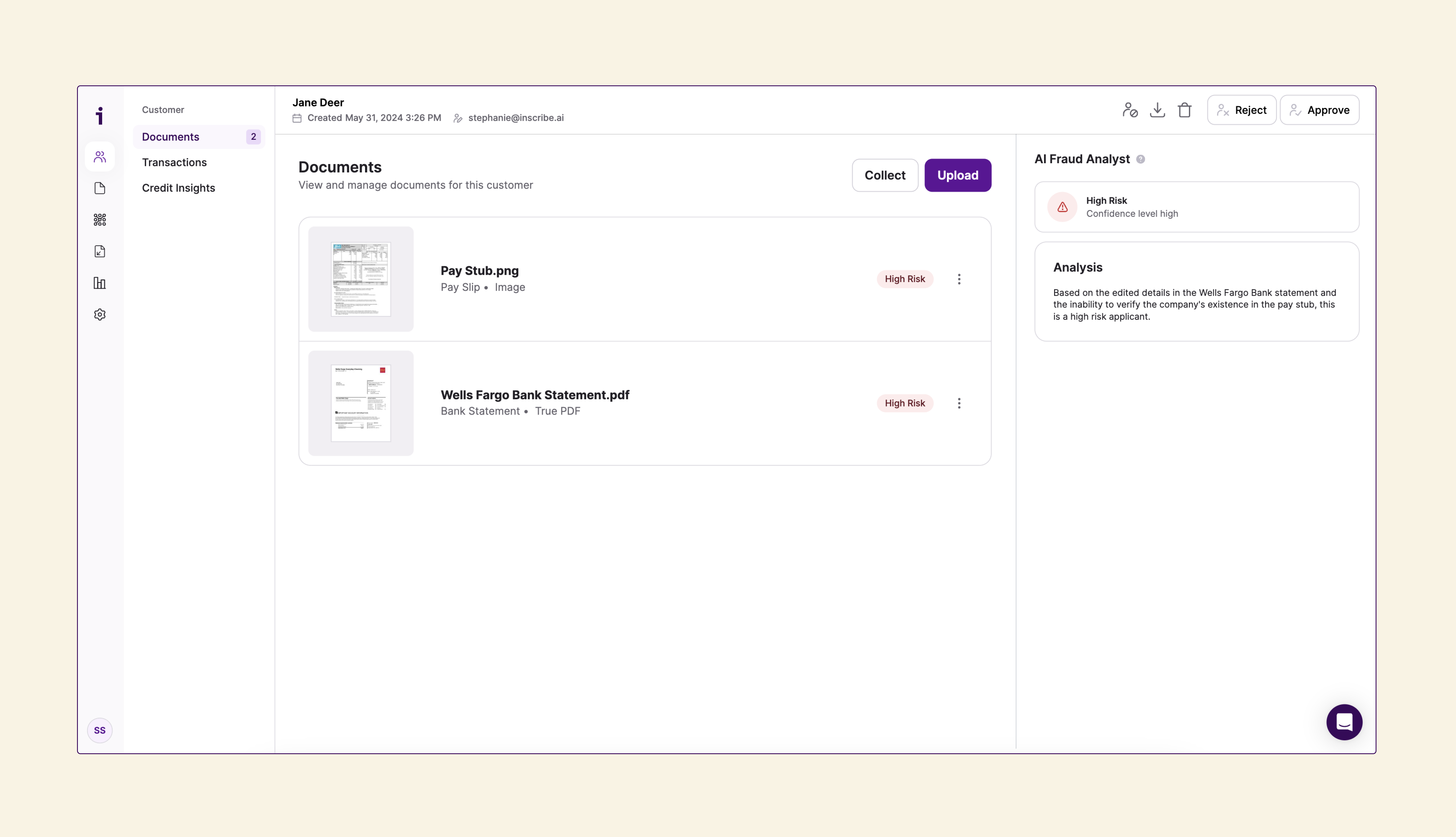 Once applicants hit 'Submit,' their documents are uploaded to Inscribe, where our AI Agents immediately start checking for fraud, verifying details, and generating auditable risk reports. This allows you to skip manual document reviews and use the reports to quickly approve or reject applicants.