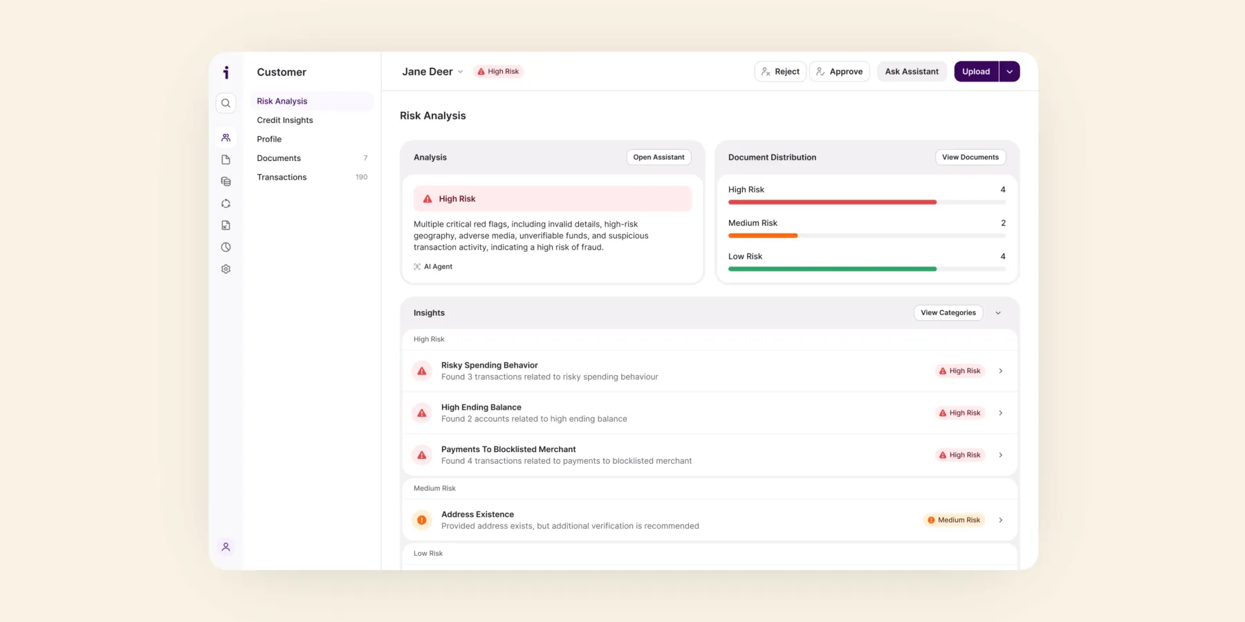 Inscribe provides a customer-level risk rating based on the holistic analysis performed across a customer’s documents, and external signals and third-party data. Each rating includes a brief, clear explanation of why it was assigned.
