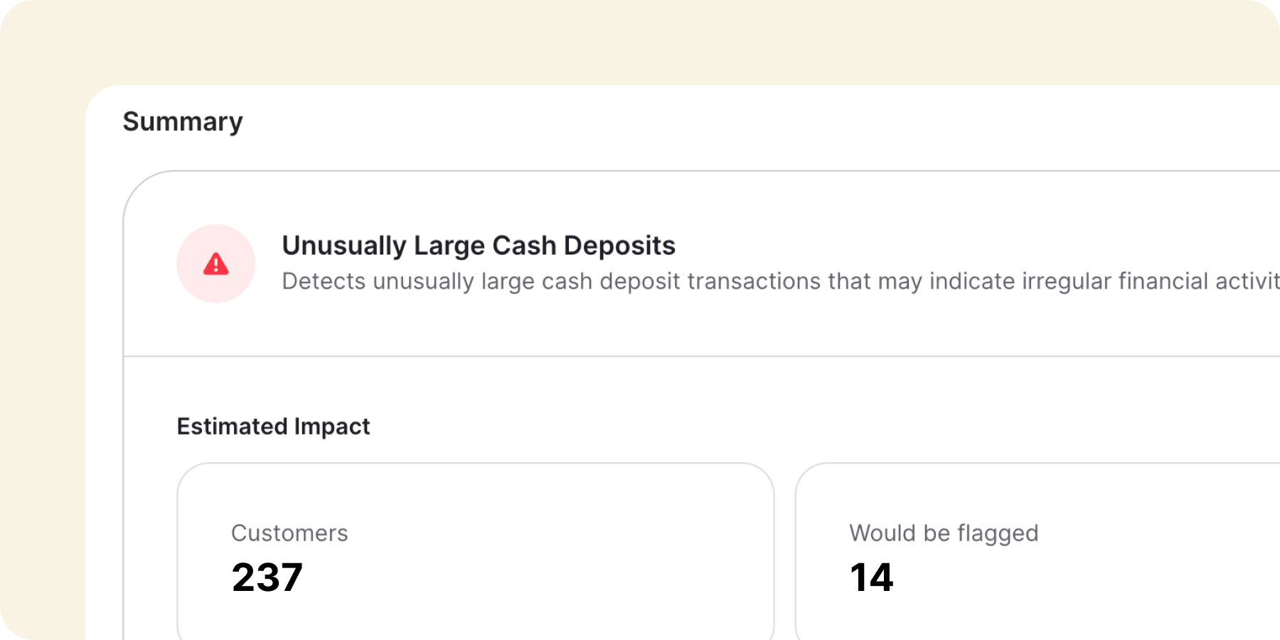 Build rules based on transaction category, merchant, payment processor, method, amount, or timeframe. Fire them based on raw transaction count or percentage of total activity. Set balance-based thresholds, track average daily balance, or flag volatility against a rolling average.